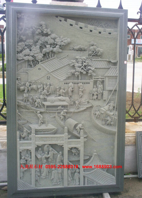 3、 沉雕。又稱"線雕",即采用"水磨沉花"雕法的藝術(shù)品。此類雕法吸收中國畫與意、重疊、線條造型散點透視等傳統(tǒng)筆法,石料經(jīng)平面加工拋光后,描摹圖案文字,然后依圖刻上線條,以線條粗細深淺程度,利用陰影體現(xiàn)立體感。此類產(chǎn)品多數(shù)用于建筑物的外壁表面裝飾,有較強的藝術(shù)性。