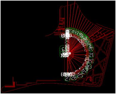 2、在建立軸網(wǎng)時(shí),因景觀類工程一般沒有標(biāo)準(zhǔn)的縱橫軸線和軸線標(biāo)識(shí),所以需要充分利用已有的電子版CAD圖。在識(shí)別CAD圖時(shí),可以把主要畫圖要用到的定位線作為軸線提取,如硬質(zhì)鋪裝和綠化邊線、人行道路沿線、林蔭步道的邊線、臺(tái)階邊線等;把其他需要輔助畫圖的線作為軸線標(biāo)識(shí)提取,如綠化盲溝線、雨污水井邊線等。總之盡可能地多導(dǎo)入CAD圖里面的線條元素。本工程導(dǎo)入CAD后如圖: