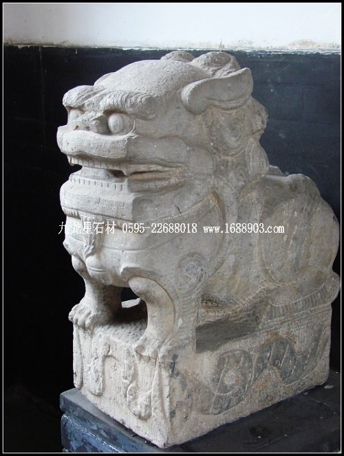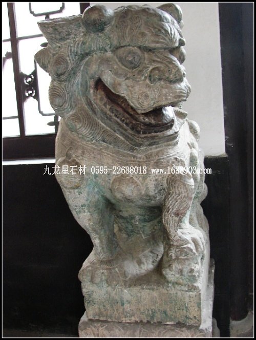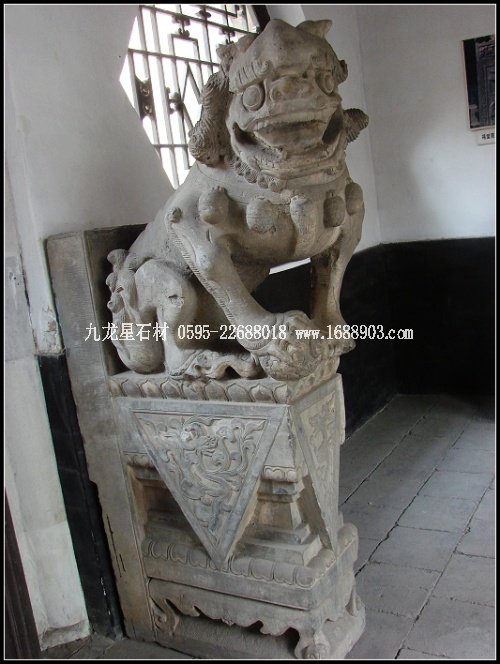 子是莊園青石雕刻的又一大類別。眾多的門墩石獅,經(jīng)清代民間藝術家的大膽想象、沿承、夸張,這一藝術品成了宅第建筑中不可替代的裝飾像,無論體量大小,均威武、高貴而又憨態(tài)可掬。為增強裝飾效果,莊園的獅子形象大多頭大臉闊,額隆頰豐,箕口肉鼻,前額突出,從禿頂式的頭部到項背披有漩式鬣毛。胸飾纓絡華飾,脖上掛有鈴鐺,形態(tài)俯首縮足。雌獅掌撫幼獅,有的還背負其子;雄獅腳踏繡球或嘴銜彩帶,背負繡球,較多地汲取了民間傳統(tǒng)舞獅藝術的成分,富有較強的鄉(xiāng)土氣息和喜慶風格。