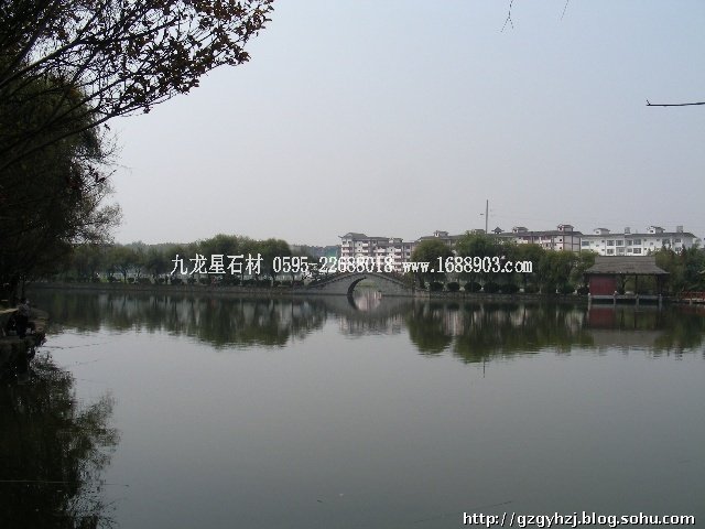 小橋綠樹(shù)垂竿倒影水中,景色麗人。