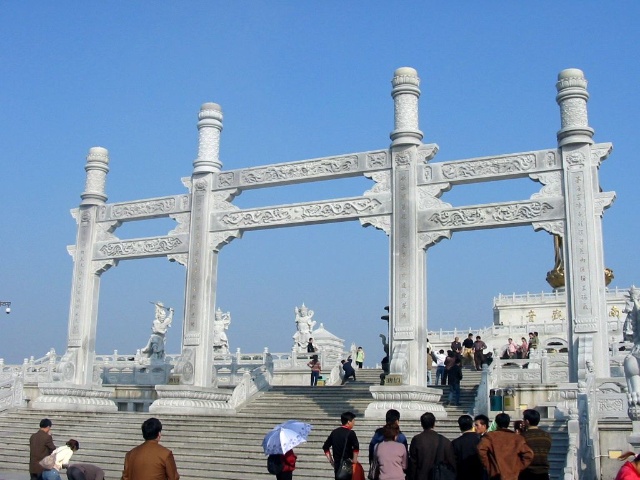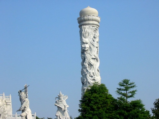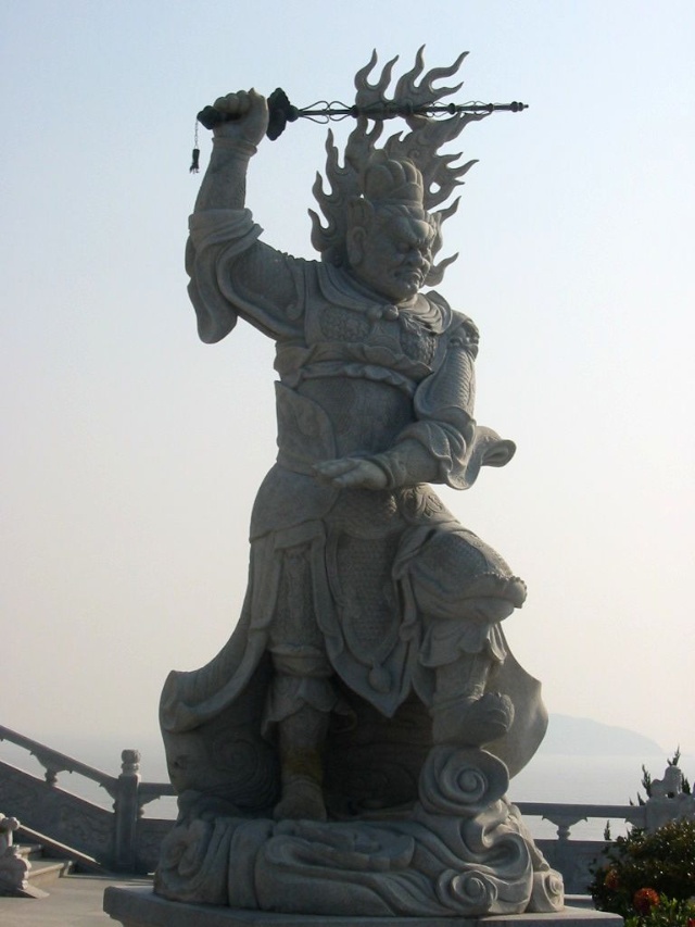 禮佛廣場上四大天王塑成了中國古代的武將形象,這是古印度佛教傳入中國后,佛教文化和中華文化相圓融的結(jié)果。 “這四大天王塑像的原形,他們的出身并不是很高貴,而是屬于那種“放下屠刀,立地成佛”的人物。四大天王原形的由來,源于古典小說“封神演義”中“魔家四將”。在周武王率兵起義,反對暴虐的無道君主——商紂王的正義戰(zhàn)爭中,這魔家四兄弟曾經(jīng)率兵于佳夢關(guān)一線阻擋周武王東進(jìn)的軍隊(duì)。經(jīng)過數(shù)番爭斗,結(jié)果是被周武王的軍隊(duì)盡數(shù)殲滅,魔里海、魔里青、魔里壽、魔里紅這四兄弟也亡命于周軍之手。戰(zhàn)爭結(jié)束后,這四個(gè)助桀為虐的“魔頭”,經(jīng)姜子牙開封神榜時(shí),就被任命為“四大天王”。
