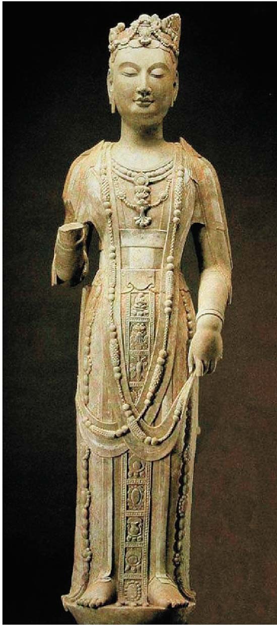 1996年,青州龍興寺遺址窯藏共出土北魏至北宋佛教造像400余尊,其中以東魏和北齊時期的數(shù)量最多。青州地區(qū)曾先后隸屬于南朝和北朝,南北文化 上的交互影響較為明顯,在公元469年北魏占領青州以前,青州長期隸屬于南朝,所以在造像風格上與北朝造像有明顯的不同。青州地區(qū)佛教造像除政治沿革遺留 的影響,還應有不同地區(qū)交流的因素。這時海路可以與東南沿海相通,笈多美術通過海路傳入也在一定程度上促進造像樣式的形成與發(fā)展。如東晉義熙年間,法顯自印度取經(jīng)回國,返抵青州,青州長廣郡太守李巍敬信佛法,迎接經(jīng)像歸至郡治,留法顯一冬一夏,法顯所奉佛像自然是地道的笈多風格。