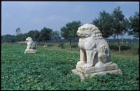 古代陵園石雕遺存實物最早的是引人注目的西漢霍去病墓石雕,作品原在陜西省興平縣漢武帝茂陵東面霍去病墓上與墓前?,F(xiàn)已發(fā)現(xiàn)的石雕作品有造型各異、天趣宛然的動物、人物等共十四件?;羧ゲ槲鳚h名將,漢武帝為表彰其功、紀念其人,于茂陵東面選定其墓址并“為冢象祁連山”,據《史記?衛(wèi)將軍驃騎傳?索隱》記:其墓“冢上有豎石,前有石馬相對,又有石人”。今存作品即記載中的部分原物。它們可以分為兩類,一是通常被稱之為“馬踏匈奴”的立馬,二是其它渚石。立馬的原在位置是墓前不遠,長年來未有大的移動,從形式上看為靜立姿態(tài),尺度適中,符合一般早期墓前石雕的制作規(guī)律,相信此即記載中相對而立的石馬,只是另一件已無存,“石人”也不見了。唐薛逢《漢武帝祠》詩云:“茂陵煙雨埋弓箭,石馬無聲蔓草寒”。詩中所指茂陵石馬當系帝陵制度,但與霍墓立馬的位置及造型表現(xiàn)肯定有直接關系。西漢時期陵園墓前設置石雕已成風氣,關于石人石獸的記載與遺存并不罕見,因此霍去病墓前石馬并非例外,實屬常規(guī)設置,它為我們提供了代所完善的石象生設置與造型形式之源的現(xiàn)知最早實物證據。