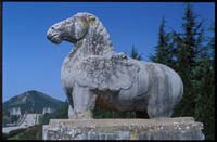 唐陵石雕藝術創(chuàng)作另一個重要的群體造型特征是運動中完成的審美感受。兩列平行的群體構成不是僅為了場面宏闊,因為橫向展開的群體也許更有宏闊場面感。夾神道而列的各類組合設置體現(xiàn)了先后出現(xiàn)的次序、高低錯落的搭配,達到了一種自始至終不斷變化而形成的審美運動過程。即是說,陵園石雕造型表現(xiàn)的完整效果是要在審美主體的運動狀態(tài)下完成的。這一運動過程在往與返的逆向運動情況下審美心理感受是兩樣的。以石雕群主體而論,審視者從神道柱端向北行進,不斷通過幾個韻律次序,到達石獅端而初步完成群體審美過程(廣而言之,實際上審視者一進入陵園,甚至一進入陵園自然區(qū)就開始處于特定的審美心理狀態(tài))。審美主體在任何一件單純作品面前無論怎樣感受均無法完成這種審美過程,它要求審視者從第一件到最后一件完整地從運動中全部感受之后得到一種綜合印象,這印象中有每一件作品的成份,卻不限于所有作品成份的總和,而是超出了這個總和,因為這印象中有時間因素,有人的行動因素。如果把石雕群體作為一個完整造型審美單位來看的話,它是具有三度空間加時間的四度空間造型,其完整的心理感受只有當主體置身神道并處在定向運動中才能完成。只有在這種運動過程顯示的伸延層次中每一單體的審美表現(xiàn)才有了完整的意義。這種審美表現(xiàn)特征與傳統(tǒng)繪畫中場面題材的散點透視法則具有相同的美學基礎。