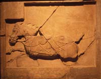 “昭陵六駿”,與其說是表現(xiàn)雕刻的美不如說是表現(xiàn)繪畫的美。據記載,昭陵是在杰出美術家閻立德主持下修建的,并由其弟閻立本圖繪十四國君長像為石刻范本。現(xiàn)存十四國君長像頭部殘塊顯示的確有寫真特征,面部皺紋用線刻形式加以表現(xiàn),甚至眼角的紋路亦不放過,形象追求“寫真性”,突出個人的容顏特點,在某種程度上帶有一定的摹刻繪畫性,不同于一般的石人。“六駿”所表現(xiàn)的是唐太宗征戰(zhàn)慣用的六匹戰(zhàn)功馬,宋游師雄題《六駿碑》中記述了石刻當時安置的次序:颯露紫(西第一)、特勒(勤)驃(東第一)、拳毛馬咼 (西第二)、青騅(東第二)、白蹄烏(西第三)、什伐赤(東第三)。“六駿”表現(xiàn)為類似于漢畫象石刻中浮雕的形式,在方形外框中刻畫馬的側面形象,韻致非常接近于唐代繪畫中馬的表現(xiàn)?!傲E”是具體指象,即“刻石為常所乘破敵馬六匹”(《唐會要?卷二十》),有形象的特定要求,而且選擇了戰(zhàn)馬中箭、奔馳、療傷的情節(jié)并刻畫出了馬頸部的“三花紋”這類細節(jié)。這都宜于繪畫表現(xiàn)而不宜于圓雕表現(xiàn)。既然人像石雕可以繪畫為范本,馬的石雕當然也完全可能以繪畫為范本。昭陵沒有效法圓雕形式表現(xiàn)鞍馬,原因之一就在于類似畫象石的浮雕形式更便于傳達繪畫性表現(xiàn)內容,避免圓雕所受的材料限制,從而傳達“六駿”特有的紀實性審美意味。