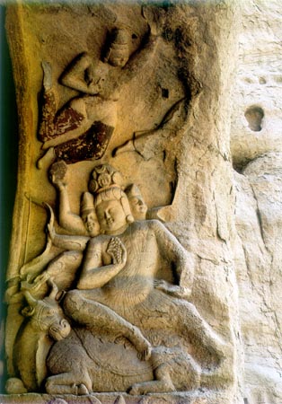 最饒有趣味的是第八窟拱門(mén)東側(cè)雕刻的摩醯首羅天和西側(cè)的鴻摩羅天,一個(gè)騎神牛三頭八臂,一個(gè)乘神鳥(niǎo)五頭六臂。這一組新奇神異的浮雕,不再是生命的寫(xiě)實(shí),而是精神的寫(xiě)意。游牧民族用審美的藝術(shù)形象折射生命現(xiàn)象中的“多頭多臂”,內(nèi)化為人類(lèi)幻想生長(zhǎng)出更多的智慧頭腦和勇敢的手臂,去征服自然,以獲得自身生命的拓展與延伸。