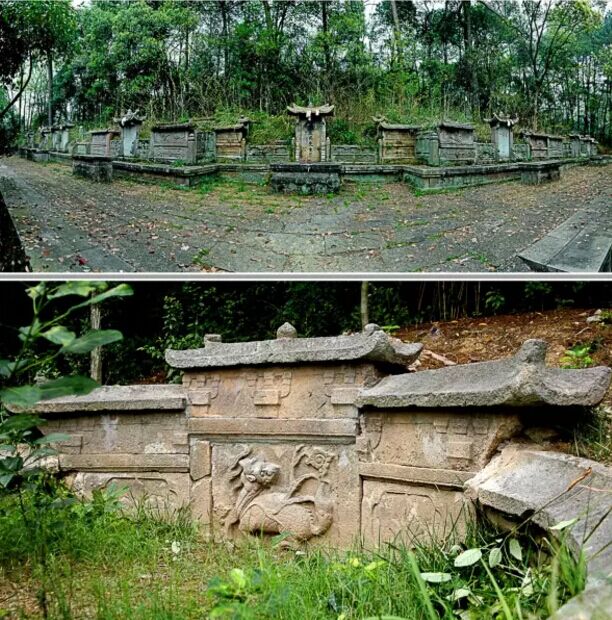 上圖:喬亭馮氏螃蟹形山墓群全景;下圖:祖墓馮伯達(dá)墓環(huán)墉上的麒麟浮雕該墓葬位于赤岸鎮(zhèn)喬亭村下西山螃蟹形山,墓向坐西北朝東南,共有墓葬11座。以祖墓馮伯達(dá)墓為核心,左昭右穆排列,符合傳統(tǒng)的禮制。墓前有供子孫祭奠的甬道、祭臺(tái)和三級拜臺(tái),還有月池。每座墓前設(shè)石供桌一張,石供桌束腰和圭腳等部位淺浮雕盤長、方勝與如意云頭等紋飾。墓前立石碑,刻墓主身份、行號等,廡殿頂碑額,以一斗三升斗栱挑檐。左右兩側(cè)石欄板圍護(hù),有單鉤欄,也有重臺(tái)鉤欄,欄板上浮雕朱雀、麒麟、仙鹿、天馬等祥瑞圖案。墓包土封,設(shè)環(huán)墉。馮伯達(dá)墓屋環(huán)墉上高浮雕麒麟回首圖案,刀法蒼勁古樸,工藝精湛。