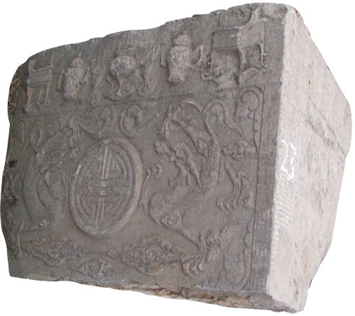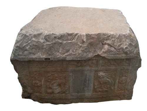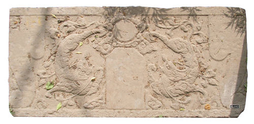 為分體式。桌裙四周刻邊框,框內(nèi)底部為海水波濤,中間有山石,即壽山福海;上部刻雙獅戲繡球。構(gòu)圖雖簡單,但布局勻稱。造型準確而動感強,突出了獅子的威猛。上有紀年款銘:嘉慶十九年(1814年)。