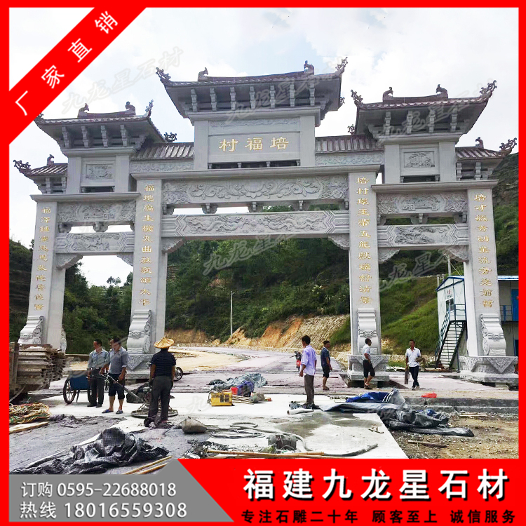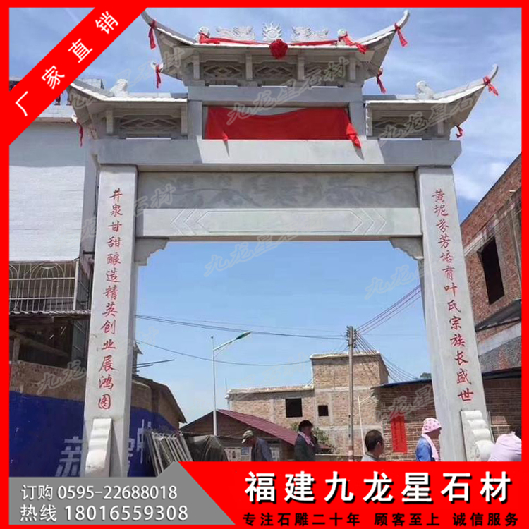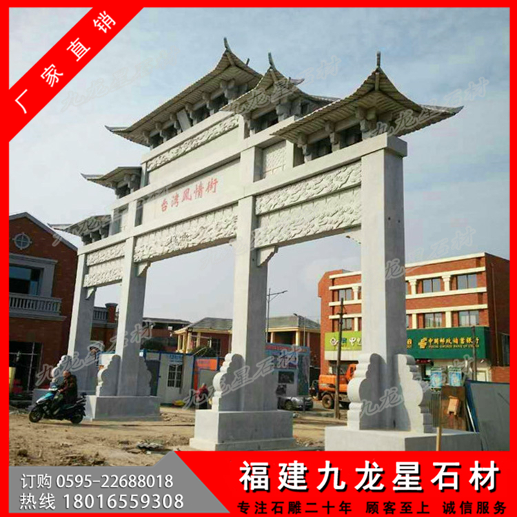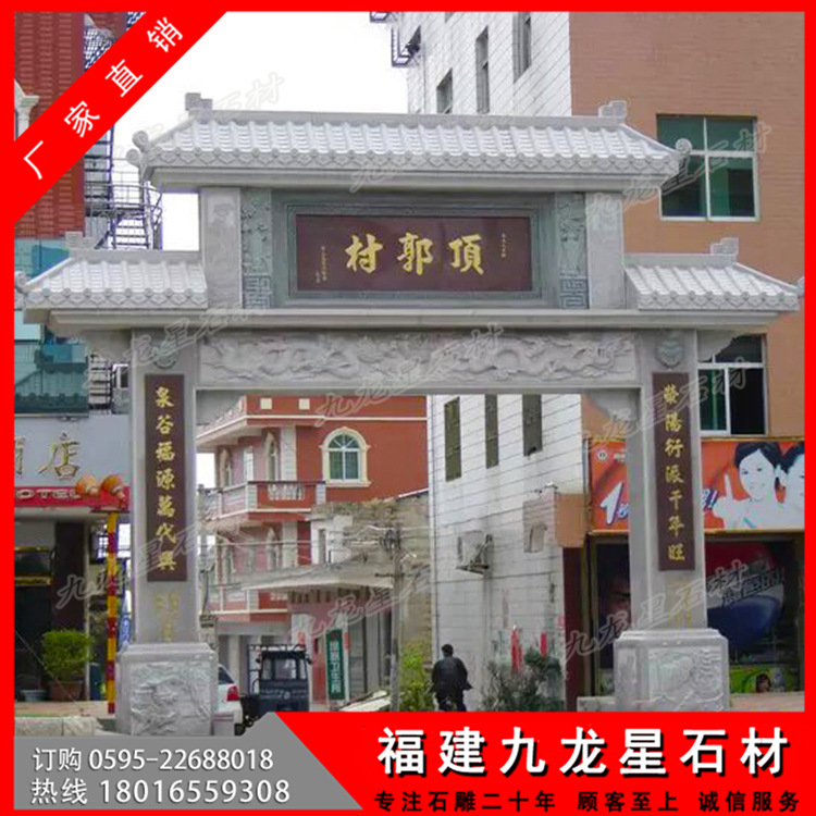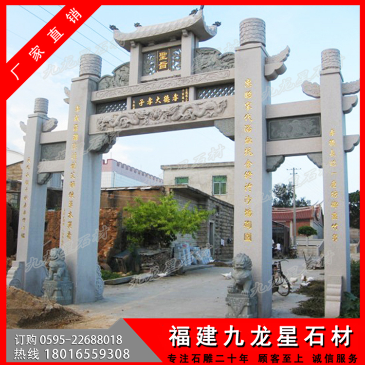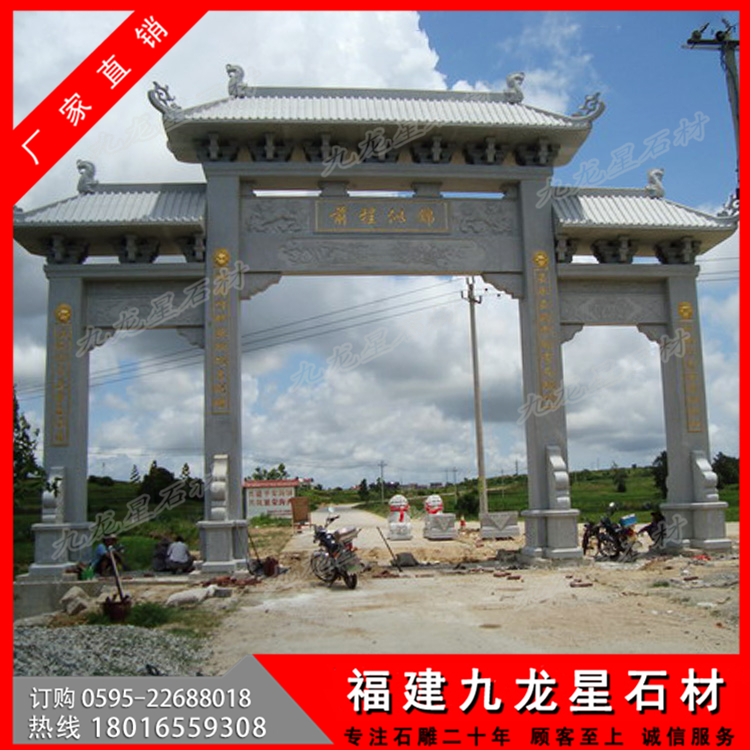 石材牌坊作為一種古色古香的建筑具有悠久的歷史,尤其是在廣大農(nóng)村地區(qū),牌坊幾乎隨處可見(jiàn)。特別是作為村莊入口牌坊,它可以作為一個(gè)村莊的標(biāo)志性建筑,受到廣泛的歡迎。無(wú)論是樣式復(fù)雜的牌坊還是簡(jiǎn)單款式的牌坊,幾乎每個(gè)村子門(mén)口都會(huì)有一個(gè)這樣的建筑。