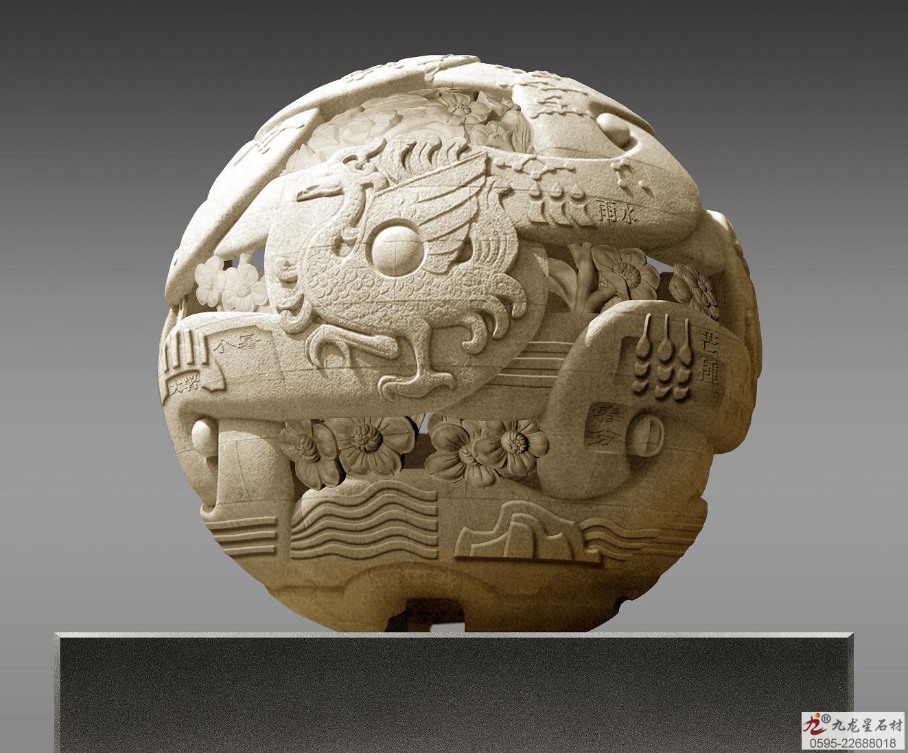 九龍星石材 > 石雕風(fēng)水球 > 石雕二十四節(jié)氣球 青龍白虎朱雀玄武球體直徑2.6米,材質(zhì)為黃銹石花崗巖。